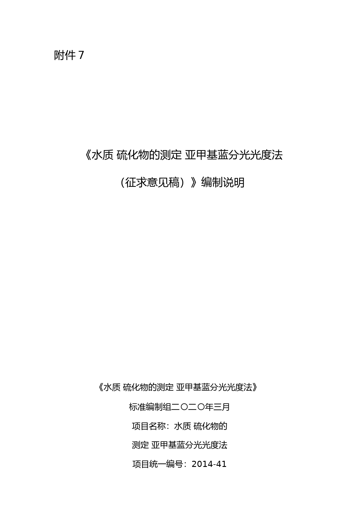 附件7《水质硫化物的测定亚甲基蓝分光光度法(征求意见稿)》编制说明《水质硫化物的测定亚甲基蓝分光光度法》标准编制组二〇二〇年三月项目名称:水质硫化物的测定亚甲基蓝分光光度法项目统一编号:2014-41承担...