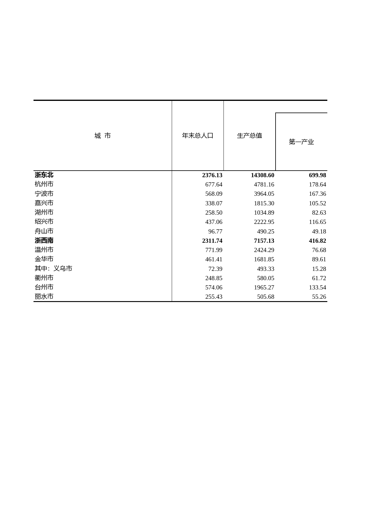 城市年末总人口生产总值第一产业浙东北2376.1314308.60699.98杭州市677.644781.16178.64宁波市568.093964.05167.36嘉兴市338.071815.30105.52湖州市258.501034.8982.63绍兴市437.062222.95116.65舟山市96.77490.2...