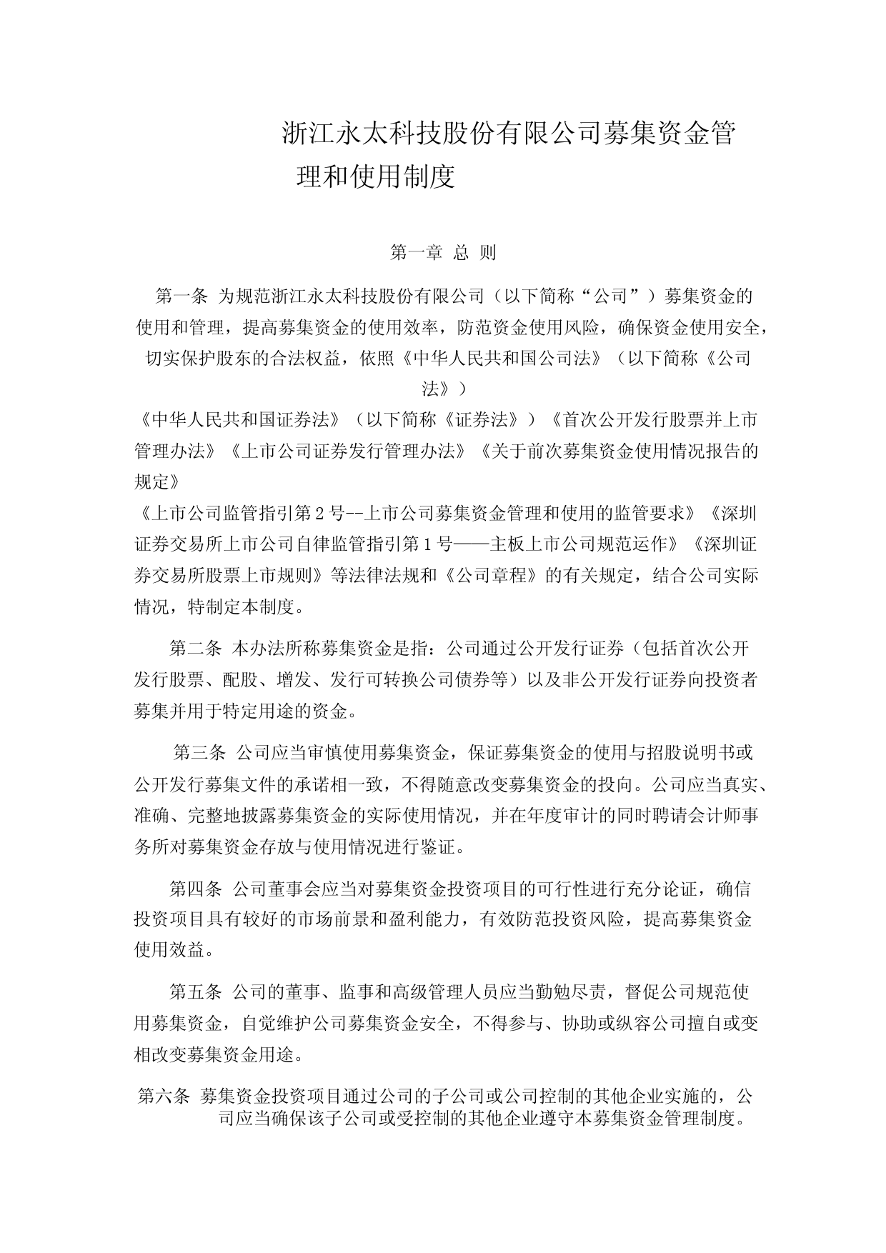 浙江永太科技股份有限公司募集资金管理和使用制度第一章总则第一条为规范浙江永太科技股份有限公司(以下简称“公司”)募集资金的使用和管理,提高募集资金的使用效率,防范资金使用风险,确保资金使用安全,切...