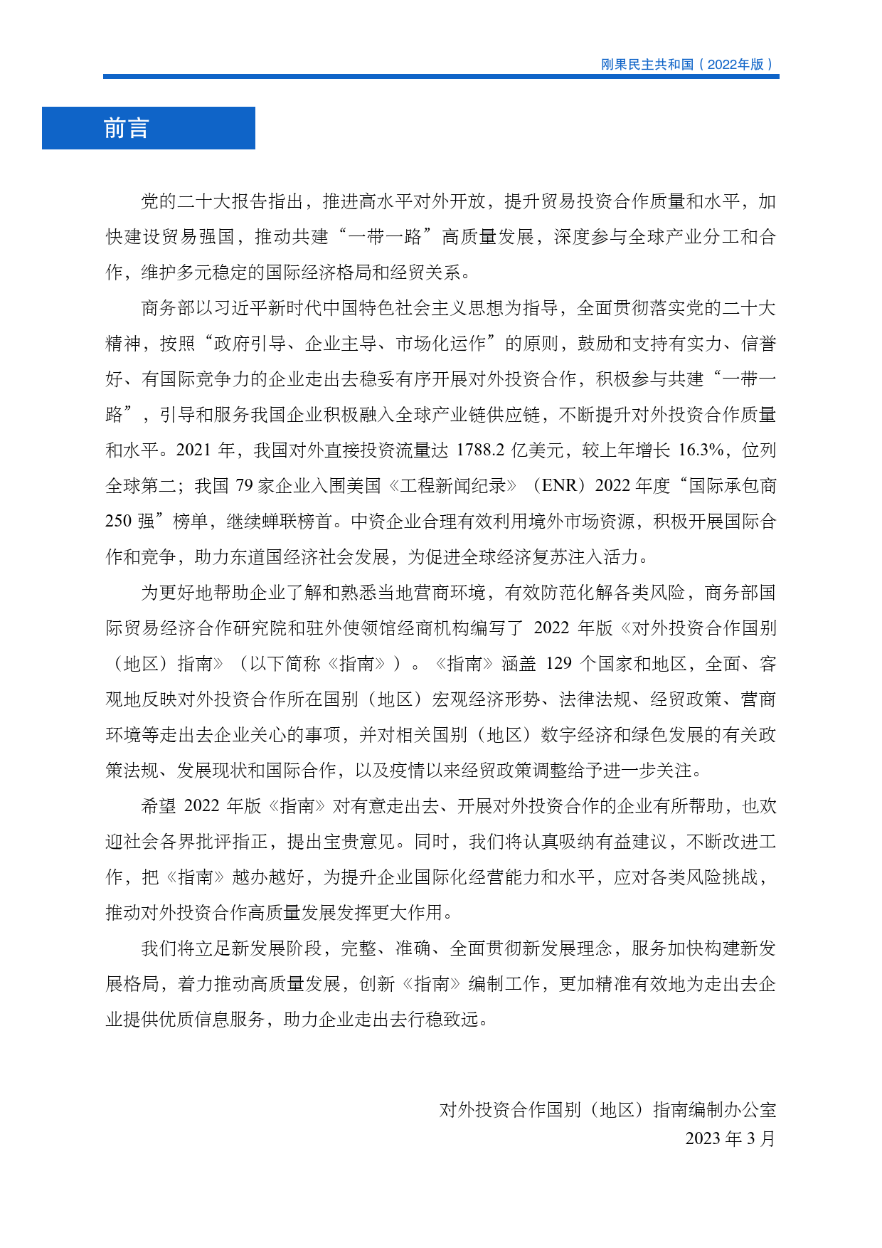刚果民主共和国(2022年版)对外投资合作国别(地区)指南刚果民主共和国(2022年版)商务部国际贸易经济合作研究院中国驻刚果民主共和国大使馆经济商务处商务部对外投资和经济合作司刚果民主共和国(2022年版)...