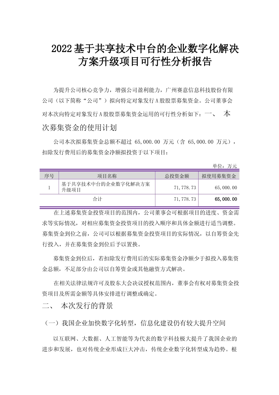 2022基于共享技术中台的企业数字化解决方案升级项目可行性分析报告为提升公司核心竞争力,增强公司盈利能力,广州赛意信息科技股份有限公司(以下简称“公司”)拟向特定对象发行A股股票募集资金。公司董事会对本...