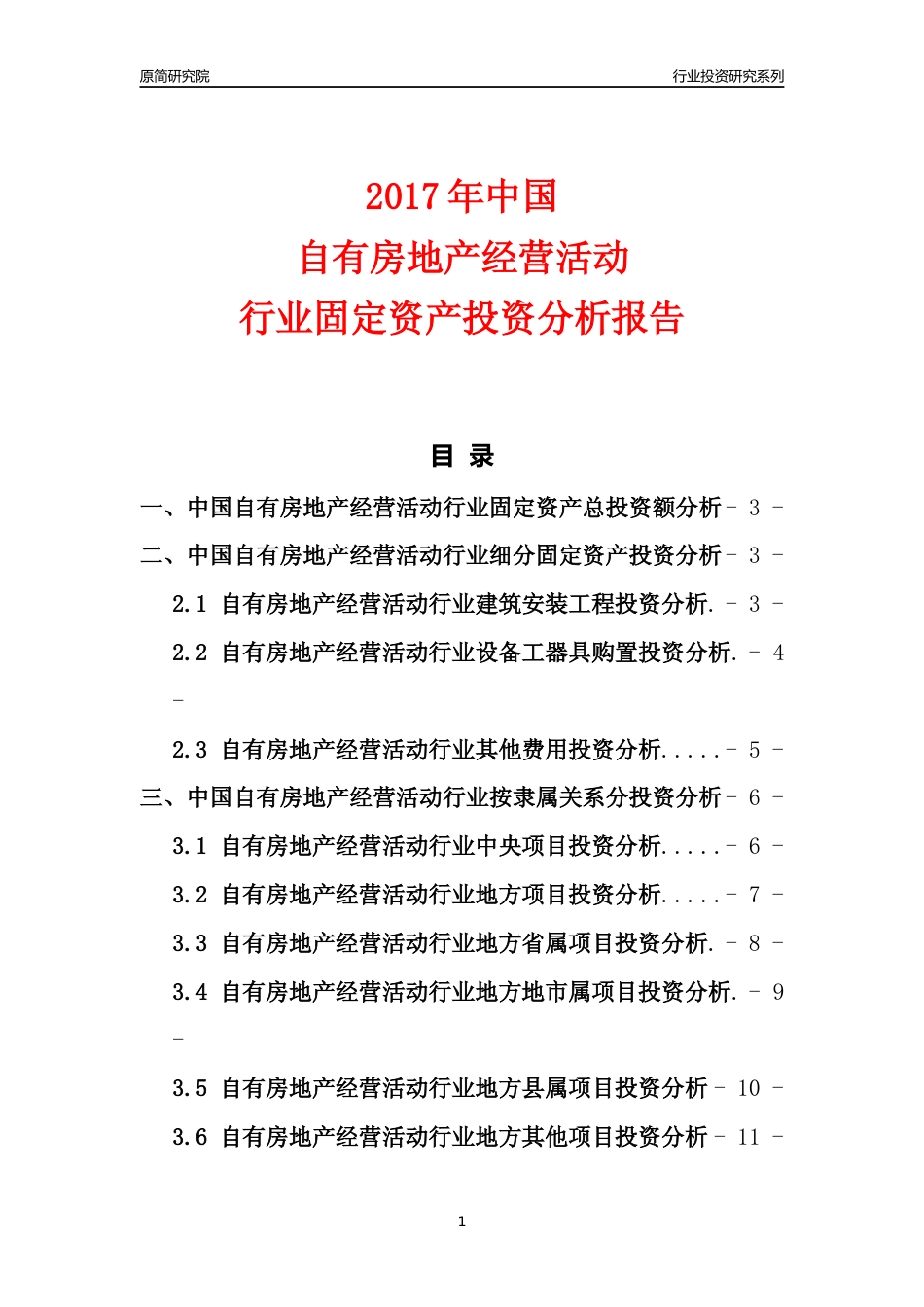 原简研究院行业投资研究系列2017年中国自有房地产经营活动行业固定资产投资分析报告目录一、中国自有房地产经营活动行业固定资产总投资额分析-3-二、中国自有房地产经营活动行业细分固定资产投资分析-3-2.1自有房...