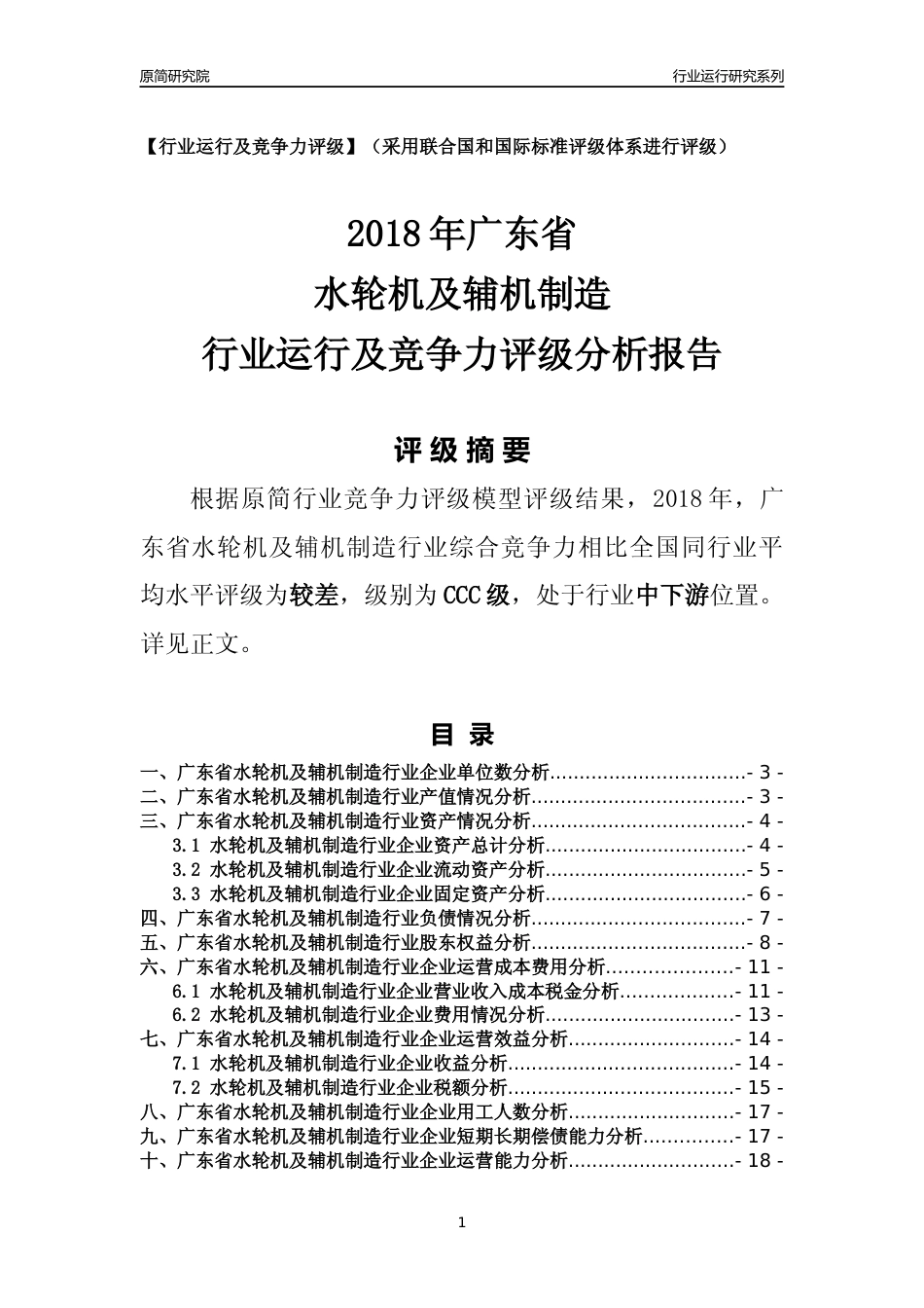 原简研究院行业运行研究系列【行业运行及竞争力评级】(采用联合国和国际标准评级体系进行评级)2018年广东省水轮机及辅机制造行业运行及竞争力评级分析报告评级摘要根据原简行业竞争力评级模型评级结果,2018年...