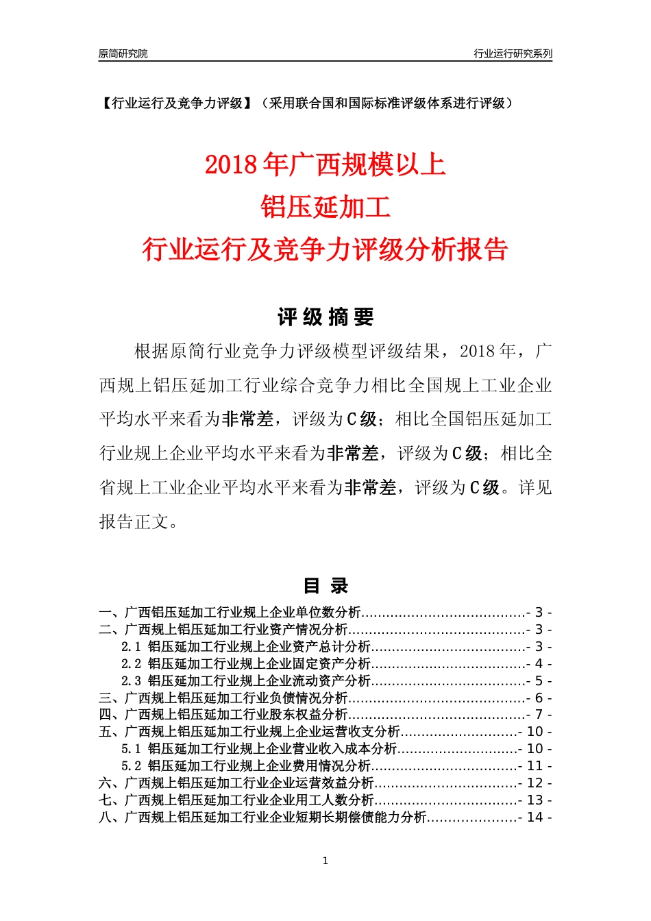 原简研究院行业运行研究系列【行业运行及竞争力评级】(采用联合国和国际标准评级体系进行评级)2018年广西规模以上铝压延加工行业运行及竞争力评级分析报告评级摘要根据原简行业竞争力评级模型评级结果,2018年...