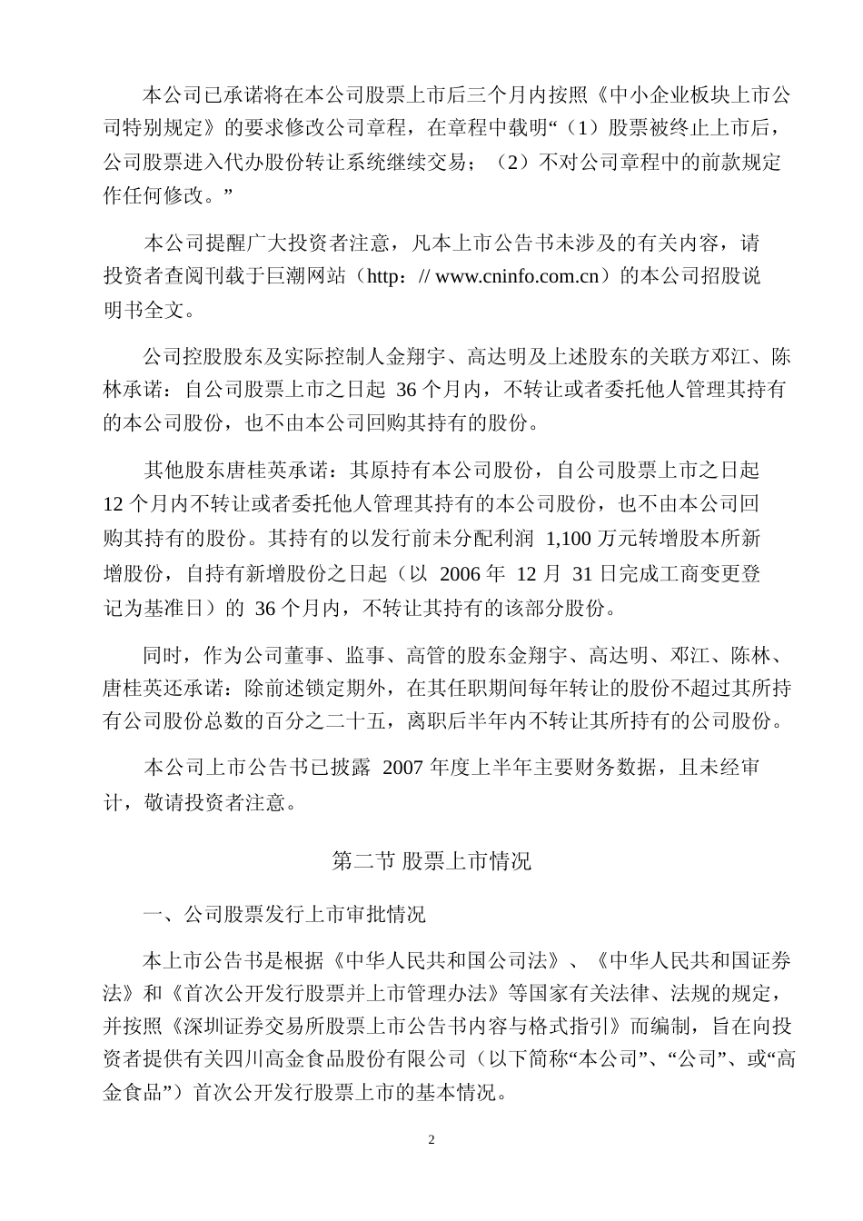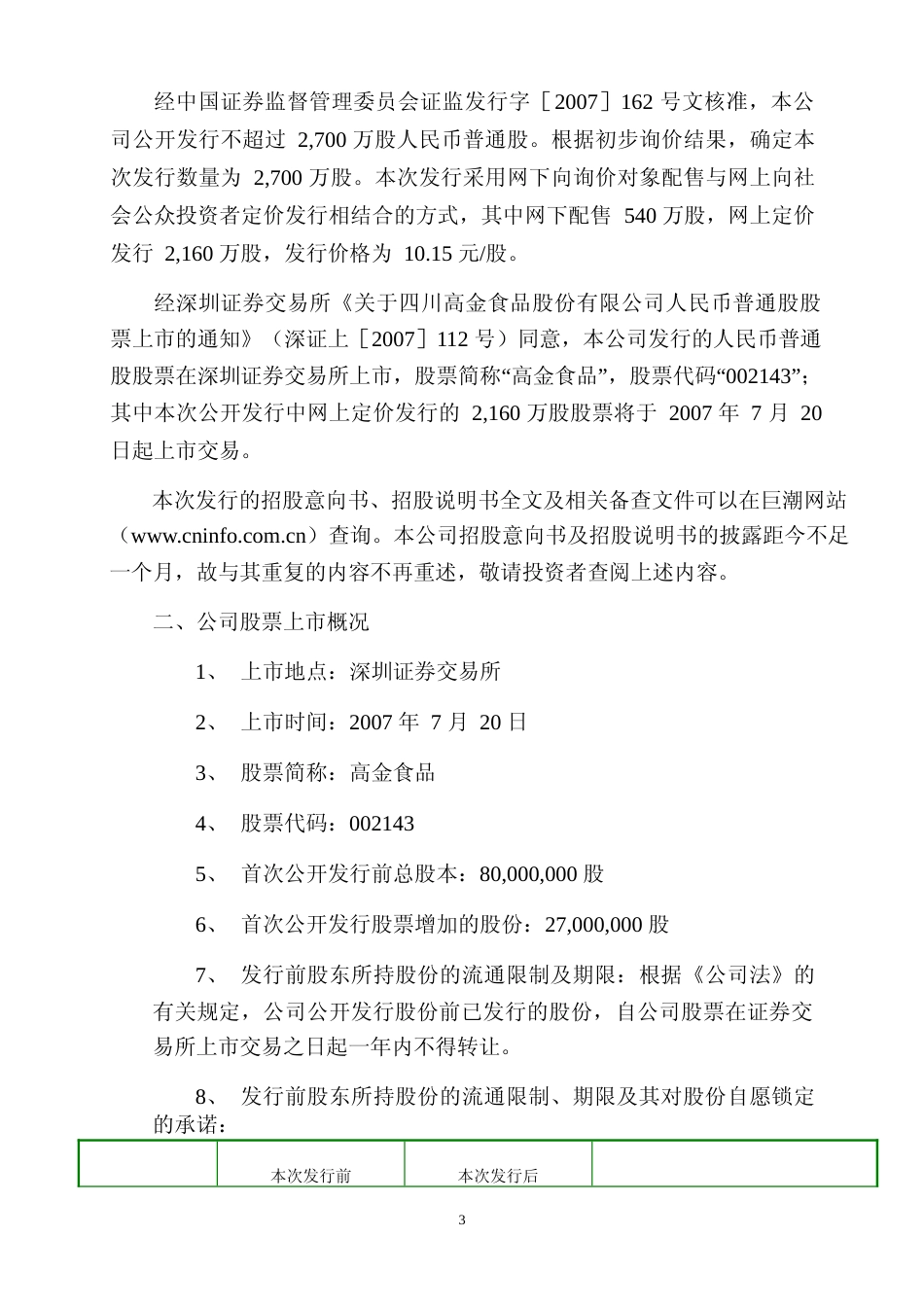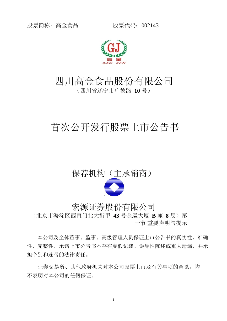 股票简称:高金食品股票代码:002143四川高金食品股份有限公司(四川省遂宁市广德路10号)首次公开发行股票上市公告书保荐机构(主承销商)宏源证券股份有限公司(北京市海淀区西直门北大街甲43号金运大厦B座8层...