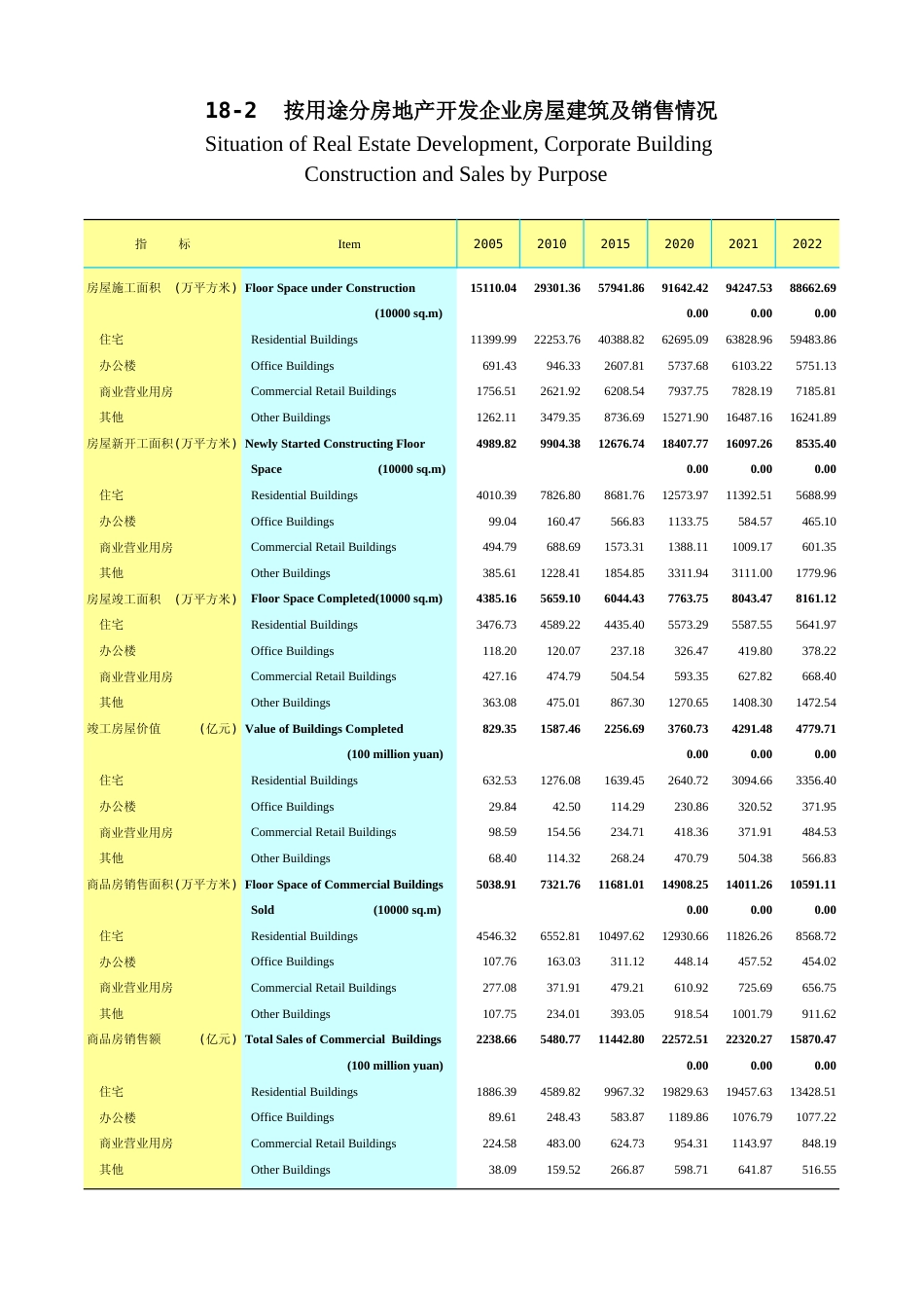 SituationofRealEstateDevelopment,CorporateBuildingConstructionandSalesbyPurpose指标Item200520102015202020212022FloorSpaceunderConstruction15110.0429301.3657941.8691642.4294247.5388662.69(10000sq.m)...