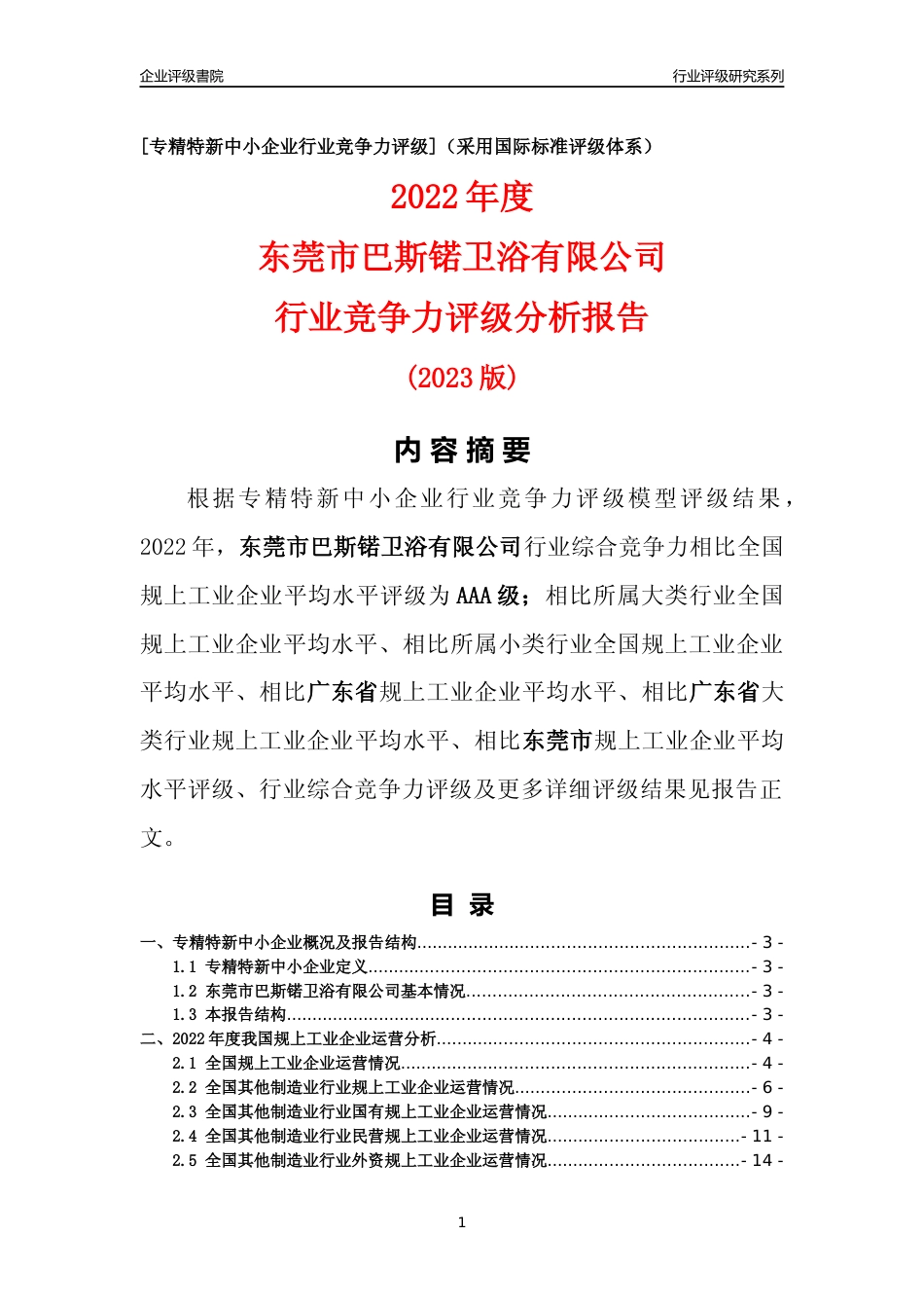 [专精特新]东莞市巴斯锘卫浴有限公司行业竞争力评级分析报告(2023版)_第1页