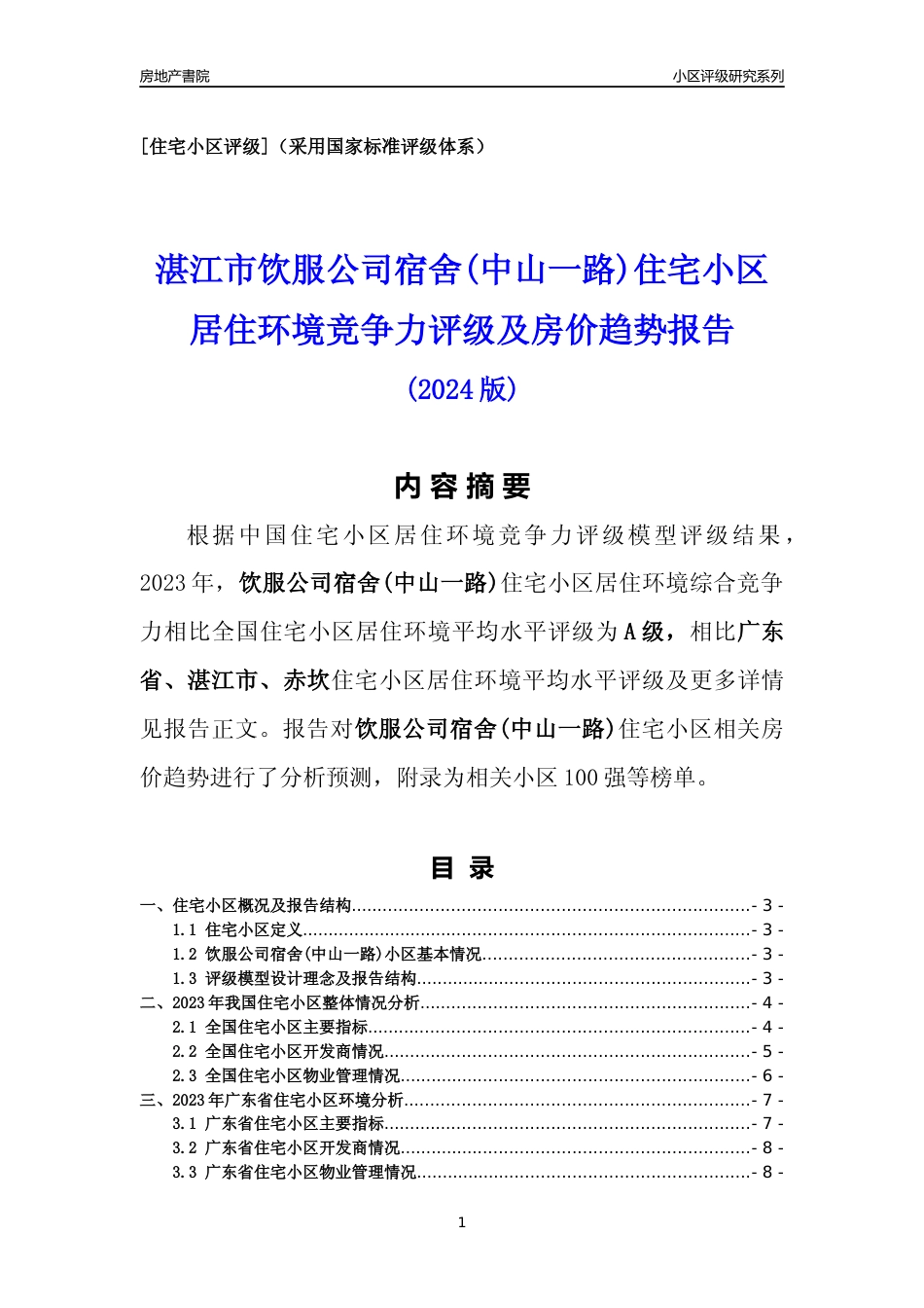 房地产書院小区评级研究系列[住宅小区评级](采用国家标准评级体系)湛江市饮服公司宿舍(中山一路)住宅小区居住环境竞争力评级及房价趋势报告(2024版)内容摘要根据中国住宅小区居住环境竞争力评级模型评级结果,2...