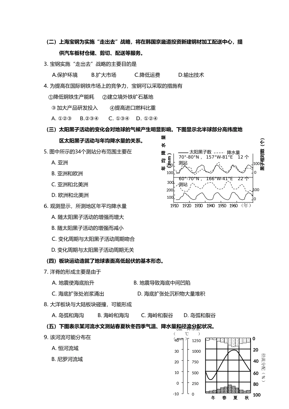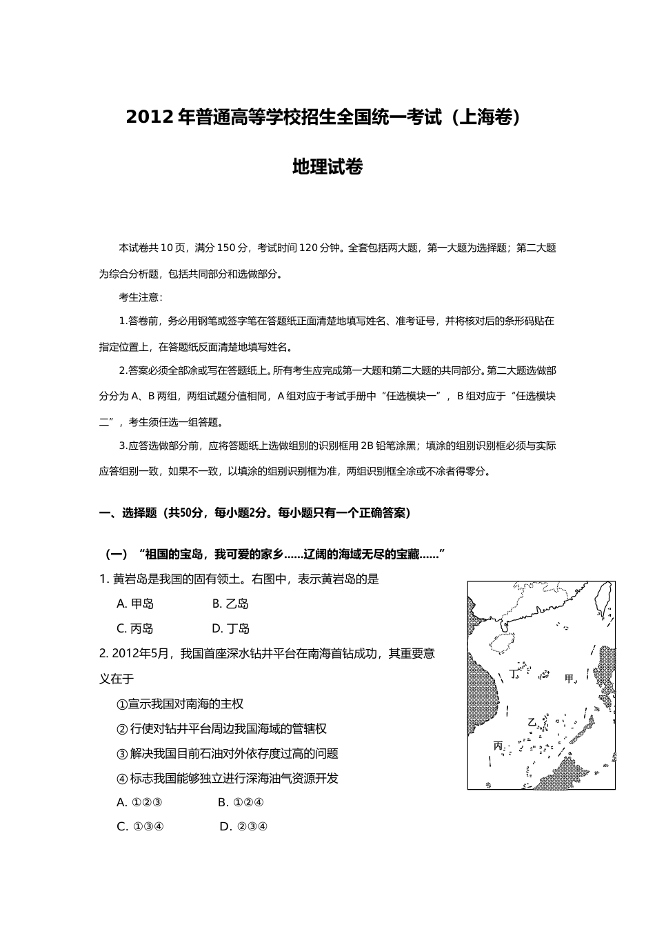 2012年普通高等学校招生全国统一考试(上海卷)地理试卷本试卷共10页,满分150分,考试时间120分钟。全套包括两大题,第一大题为选择题;第二大题为综合分析题,包括共同部分和选做部分。考生注意:1.答卷前,务...
