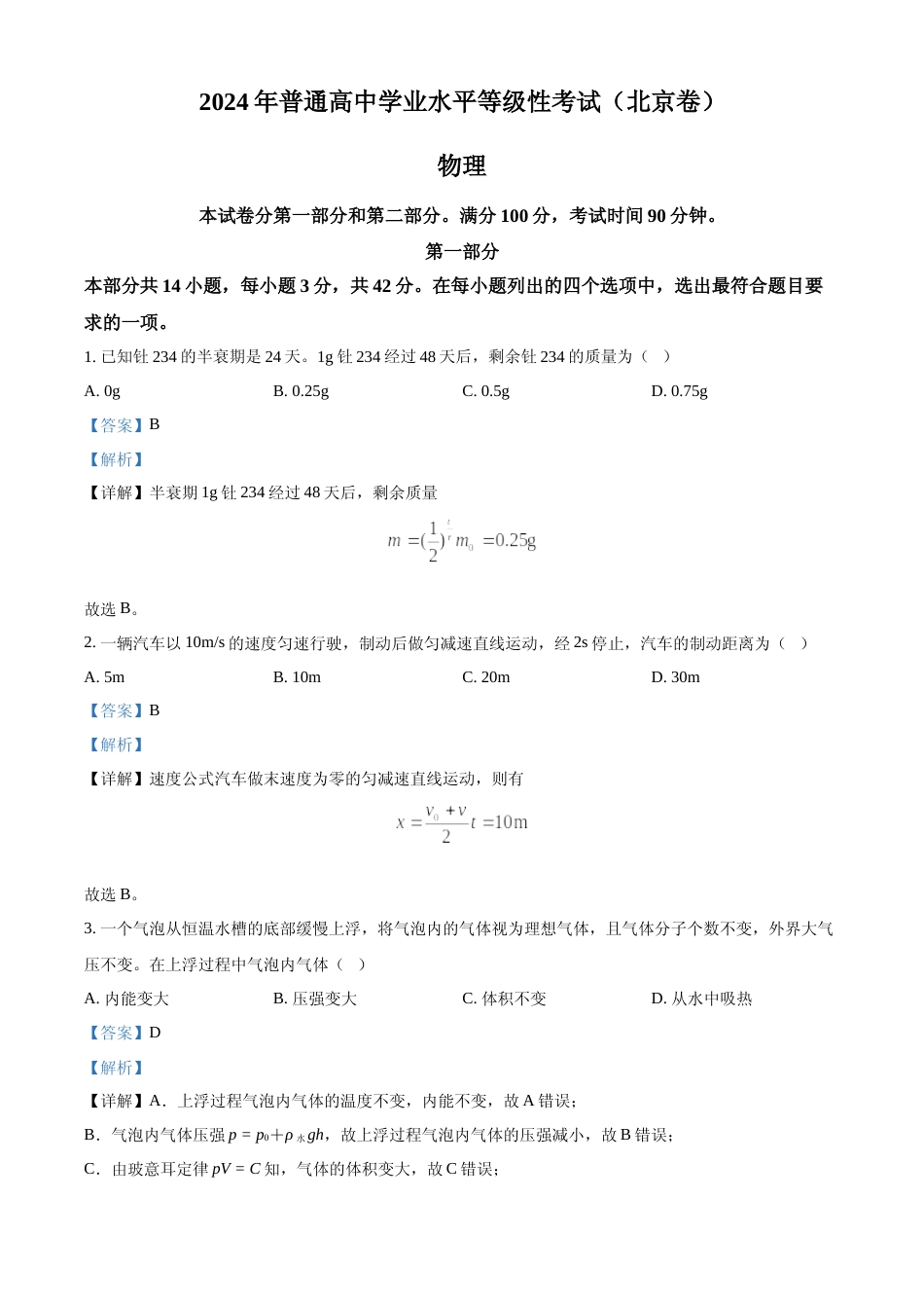 2024年普通高中学业水平等级性考试(北京卷)物理本试卷分第一部分和第二部分。满分100分,考试时间90分钟。第一部分本部分共14小题,每小题3分,共42分。在每小题列出的四个选项中,选出最符合题目要求的一项。1...