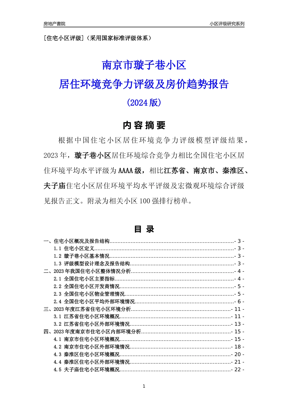 房地产書院 小区评级研究系列[住宅小区评级](采用国家标准评级体系)南京市璇子巷小区居住环境竞争力评级及房价趋势报告(2024 版)内 容 摘 要根据中国住宅小区居住环境竞争力评级模型评级结果 ,2023 年...